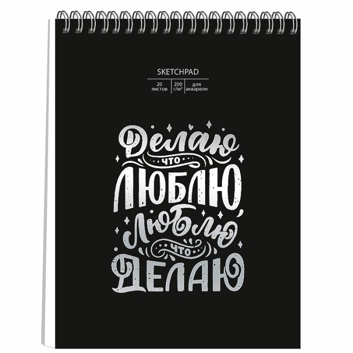 Скетчпад для акварели А4 (210х286) 20л. Евроспираль. Обл.черн.тон.карт,тисн.фольгой серебро. Подложка:пер.карт. Блок:акварель.бум.200г,белая. Перфорац. "На своей волне"