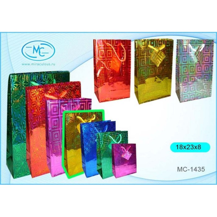 Подарочный пакет: бумажный, голография /крупный рисунок/, цвета в ассортименте, 18*23*8 см МС-1435