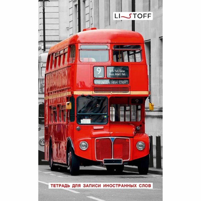 Тетрадь для записи иностранных слов А6 48л. Скрепка. Обл.: мел. картон, глянц ламинация. Внутр. блок - однокрас. печать, спец. линовка. Бум. оф.60 г. "Красный автобус"