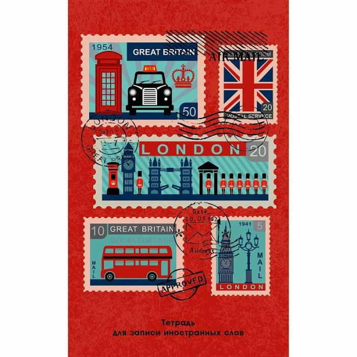 Тетрадь для записи иностранных слов А6 48л. Скрепка. Обл.: мел. картон, глянц ламинация. Внутр. блок - однокрас. печать, спец. линовка. Бум. оф.60 г. "Почтовые марки"