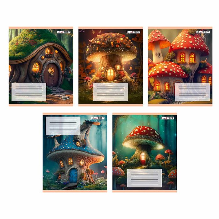 Тетрадь А5 24л. Скрепка. Клетка. Обл.: мел. картон, выб. лак, Бум. оф.60 г/м2. Поля. Уп./гофр.. "Сказочные домики (Универсальная плашка)"