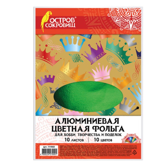 Набор цветной фольги ОСТРОВ СОКРОВИЩ предназначен для творчества, хобби, моделирования, оформления презентаций как любителями, так и профессионально занимающимися людьми. Настоящая алюминиевая фольга на бумажной основе представлена в формате А4 (210х297 мм). В наборе 10 листов и 10 ярких выразительных цветов. Поставляется в пакете. Тип фольги: однотонная. Формат: А4. Количество листов: 10. Количество цветов: 10. Рисунок: отсутствует. Вид упаковки: в листах. Ширина: 210 мм. Длина: 297 мм. Упаковка: пакет Бренд - ОСТРОВ СОКРОВИЩ. Производитель - Китай. Артикул - 111960. Штрихкод - 4606224279091