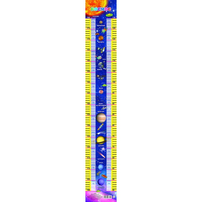 Как весело и интересно узнать точный рост ребёнка дома? В этом поможет ростомер из мелованного картона "Космос". Измеряя прогресс в росте малыша, он одновременно, будет знакомиться с планетами Солнечной системы, запоминать их название. Для этого необходимо закрепить ростомер на вертикальной поверхности и диаграмма готова к применению. Измерение составляет две шкалы от 50 до 130 в сантиметрах и от 100 до 180 в дюймах. Красочно оформленный ростомер подойдет к любому интерьеру детской комнаты, группы детского сада и других игровых комнат.