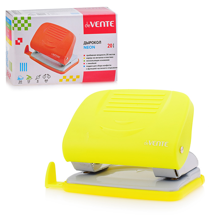 Дырокол "Neon" (20 листов) пластиковый с линейкой, в картонной коробке, неоновый желтый 4020801