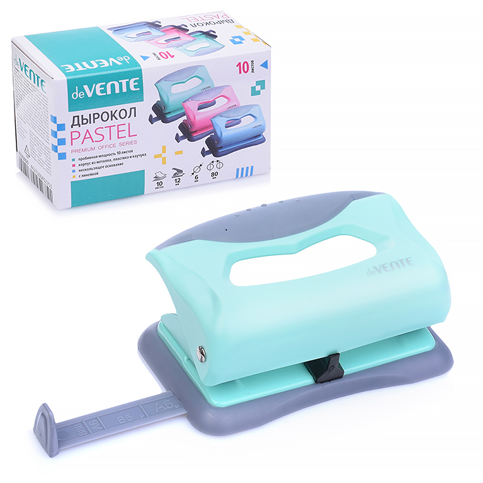 Дырокол "Pastel" (10 листов) пластиковый с каучуковой вставкой, с линейкой, в картонной коробке, 3 пастельных цвета ассорти 4020900