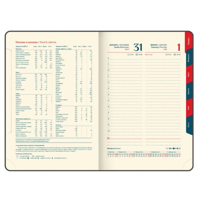 Дополнением является закладка-ляссе, с помощью которой при необходимости можно быстро открыть ежедневник на нужной странице. Ежедневник снабжен обширным справочным материалом. В конце есть 6 страниц для записей и заметок.