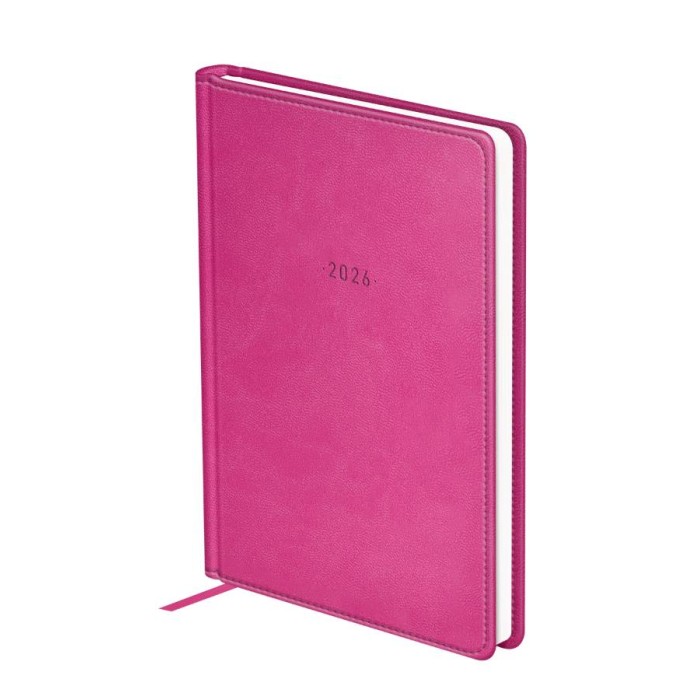 Элегантный датированный ежедневник на 2026 год BG формата А5 серии серии Winner в твёрдой обложке цвета фуксии, выполненной из высококачественной экокожи с гладкой матовой поверхностью и поролоновой прослойкой. Внутренний блок состоит из 176 листов белой офсетной бумаги плотностью 70 г/м2 с печатью в 2 краски. Датированный ежедневник представлен в размере 145*205 мм.