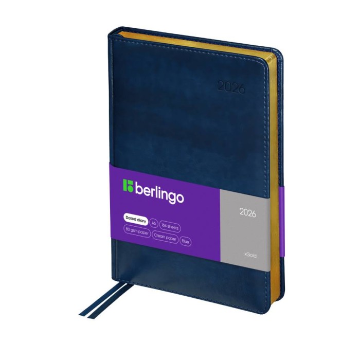 Датированный ежедневник на 2026 год Berlingo "xGold" формата А5 идеален для повседневного использования. Модель представлена с глянцевой обложкой из рельефной экокожи, которая имитирует кожу первоклассной выделки, и поролоновой прослойкой. Сочетание золотого фольгированного среза и синей обложки делает ежедневник элегантной деталью делового образа.