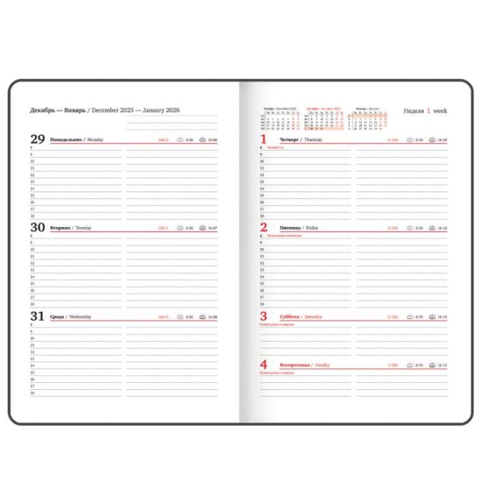 Дополнением является закладка-ляссе, с помощью которой при необходимости можно быстро открыть еженедельник на нужной странице. Для заметок в еженедельнике есть 7 страниц в конце внутреннего блока. Еженедельник снабжен обширным справочным материалом.