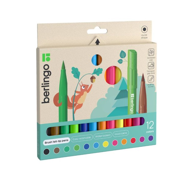 Фломастеры-кисти Berlingo "Brush" позволят каждому почувствовать себя художником. Двенадцать красочных оттенков в наборе легко внесут разнообразие в любой стиль рисования. Толщина линии может варьироваться от 1 до 7мм в зависимости от угла наклона кистевого наконечника, что дает возможность прорисовать как тонкие контурные линии, так и заполнить рисунок цветом, избегая четких границ. Трехгранная зона захвата добавляет комфорта при использовании фломастера. Чернила на водной основе оставляют на бумаге яркие цвета, при этом их легко отстирать при попадании на одежду. Не имеют запаха, безопасны для детей и взрослых. Упакованы в картонную коробку с европодвесом.