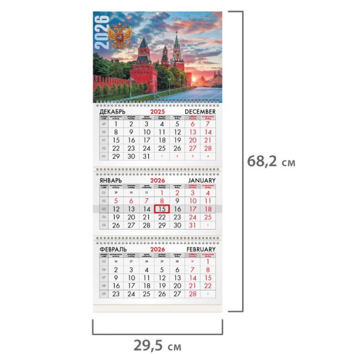 Офисный календарь на 2026 год на 3 гребнях. Для удобства планирования состоит из 3 блоков с календарными сетками на три месяца – предыдущий, текущий и следующий.
