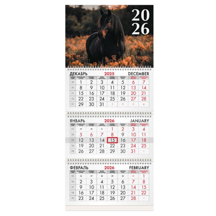 Офисный календарь на 2026 год на 3 гребнях. Состоит из 3 блоков с календарными сетками на три месяца – предыдущий, текущий и последующий. Блок календаря напечатан на офсетной бумаге плотностью 65 г/м2. Подложка изготовлена из мелованного картона плотностью 235 г/м2. Курсор-бегунок выделяет текущую дату. Вертикальный формат.
