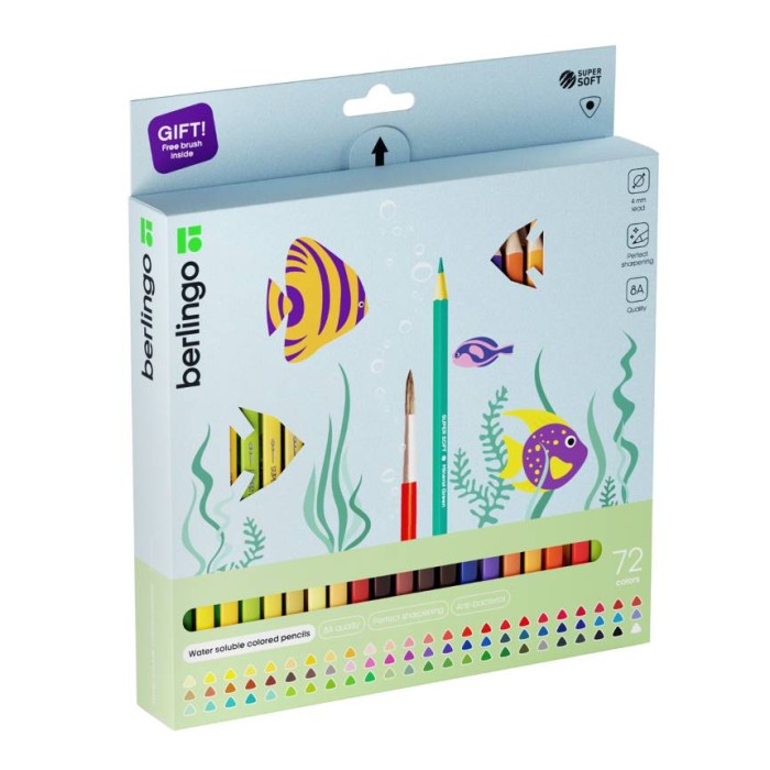 "SuperSoft" - линейка качественно новых цветных карандашей Berlingo. Акварельные карандаши Berlingo обладают идеальной растворимостью, отличной смешиваемостью, мягким письмом и яркими красками. 72 цвета. Кисть в комплекте. Эргономичная трехгранная форма. Указание цвета на каждом карандаше на английском языке. Поле для подписи имени владельца на каждом карандаше. Упаковка в плотную матовую картонную коробку со склеенным европодвесом. Пластиковый трей внутри предотвращает скатывание карандашей и позволяет легко собирать их в коробку.