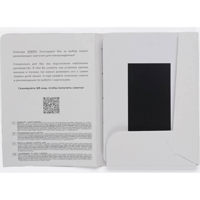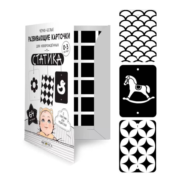 Черно-белые карточки для развития зрения новорожденных и малышей до 3 месяцев. 32 двусторонние карточки формата А6 с контрастными изображениями, изготовленные из плотного картона с закругленными углами. Стимулируют зрительные навыки, помогая различать объекты, развивать остроту зрения и светоощущение, фокусировать взгляд и развивать координацию. Успокаивают малыша. Карточки упакованы в удобную папку для хранения, их можно использовать дома, в дороге или во время прогулок.