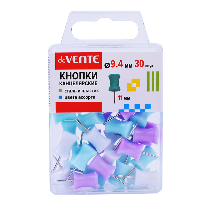 Кнопки канцелярские силовые "Pastel" диаметр 9, 4 мм, цветные в форме гвоздика, 30 шт в пластиковой коробке 4132312
