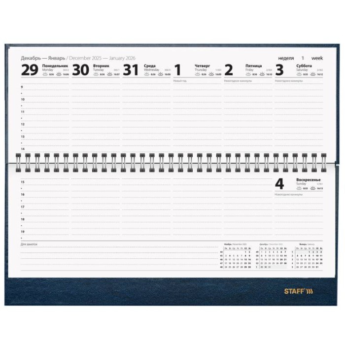 В датированном планинге STAFF все дни недели расположены на одном развороте, благодаря чему очень удобно планировать важные дела на неделю вперед.