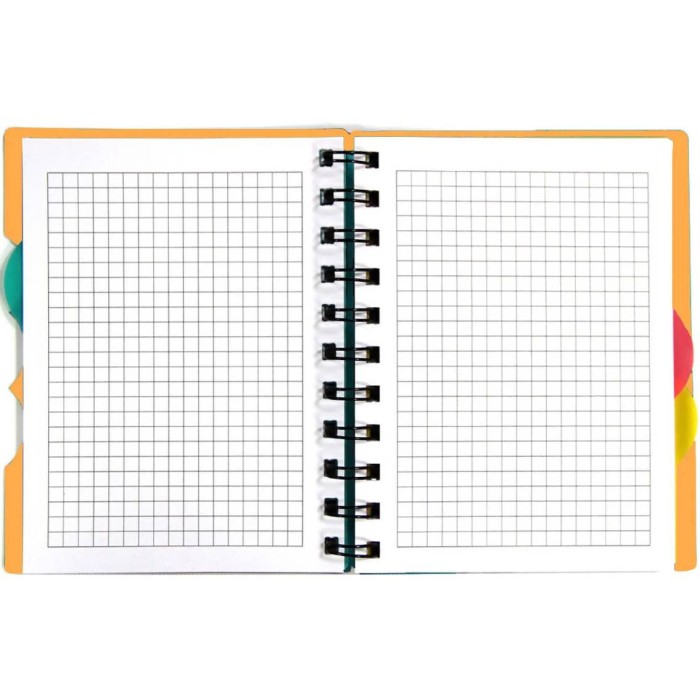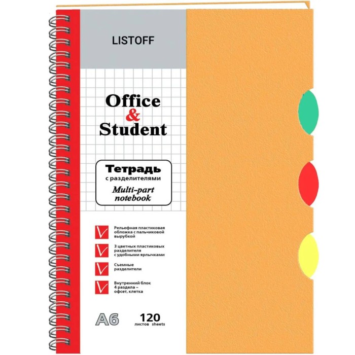 Тетрадь формата А6 содержит 120 листов в клетку. Тетрадь оснащена пластиковой обложкой и разделителями — это удобный инструмент для деловых людей, которым нужно логически разделить записи, и студентов, которым хочется поместить весь семестр в одной тетради. Пять цветных пластиковых разделителей помогут быстро ориентироваться в текстах, а пальчиковые вырубки на обложке можно пометить и тогда будет ясно, в каком блоке нужно искать нужную информацию.