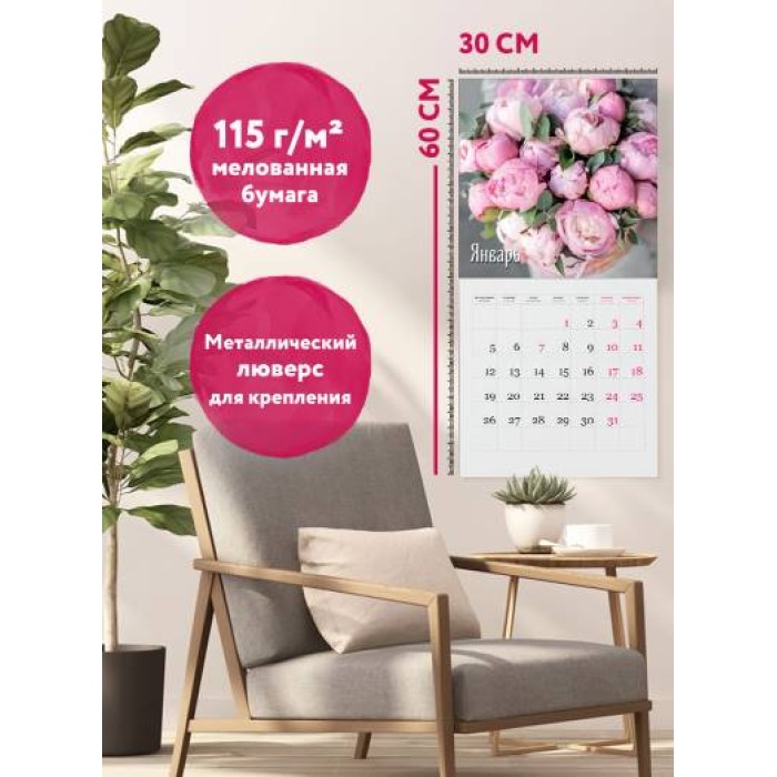 Белые, красные, розовые — великолепные пионы в одном календаре. Каждый месяц представлен оригинальным букетом в соответствии с цветовой гаммой сезона.