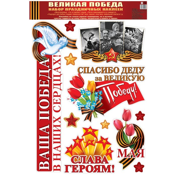 Н-13242 Набор праздничных наклеек. Великая Победа! (с уф-лаком в индивидивидуальной упаковке с европодвесом и клеевым клапаном)